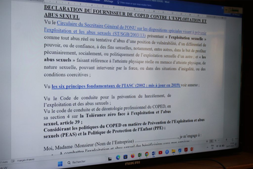 Cette séance avait objectif principal d’informer les fournisseurs et les agents de passation de marchés de COPED, les éléments essentiels et obligatoires des dossiers d’appel d’offres (DAO)que COPED publie pour l’acquisition de biens et services, afin de les amener à bien interpréter et comprendre les termes de ces Dossiers d’Appel d’Offre (DAO). La séance a été animé par Diomède Mujojoma, président de passation des marchés au COPED. Il a été complété Par Dr Audace Akimana, sur l’importance de la déclaration du fournisseur de COPED contre l’exploitation et abus sexuel.